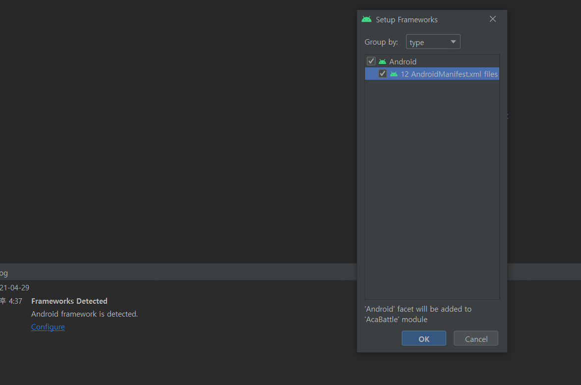 Configure를 누르고, 해당 프레임워크로 적용을 시키고, Run을 해보았는데, 다음과 같은 오류를 확인했다. 추가적으로 build.gradle(module)에선 targetSdkVersion에서 오류가 났고 API 레벨이 더 높은 것을 요구하는 것을 확인했다.