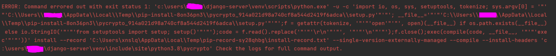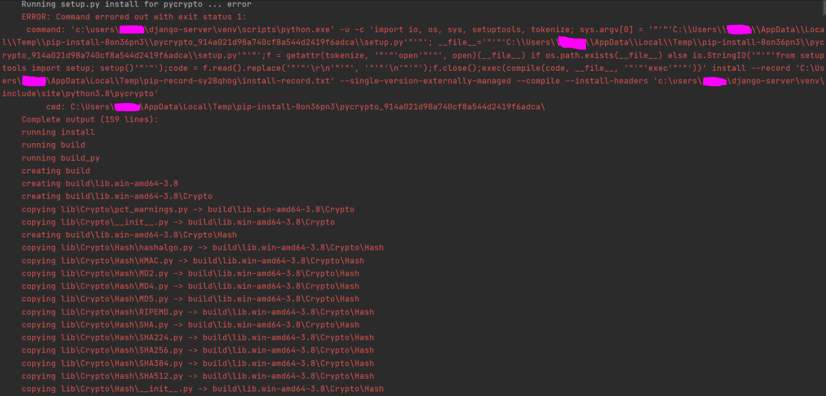 [Django, Issue] Running setup.py install for pycrypto ... error. ERROR : Command errored out with exit status 1: