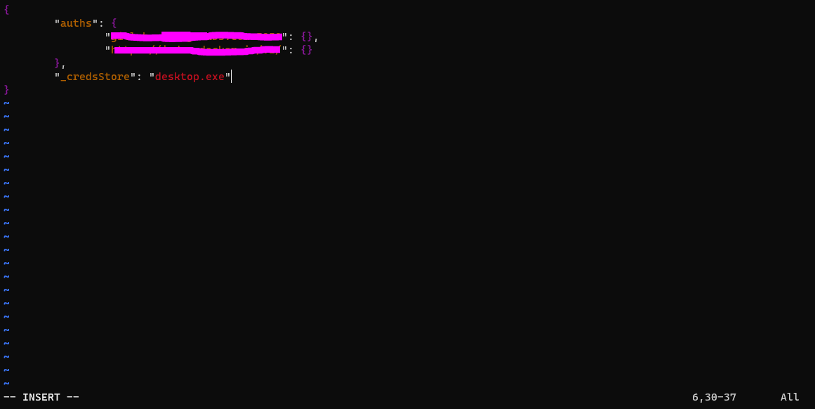 4. 다시 config.json 파일로 가서. credsStore로 다시 s추가해주고, 앞에 _ 추가.