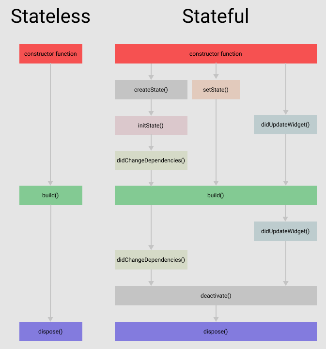 dispose : tree에서 개체가 영구적으로 제거되면 호출된다. 예를 들어 Navigator.pushRelacement을 사용하여 위젯을 다른 위젯과 복제할 때.