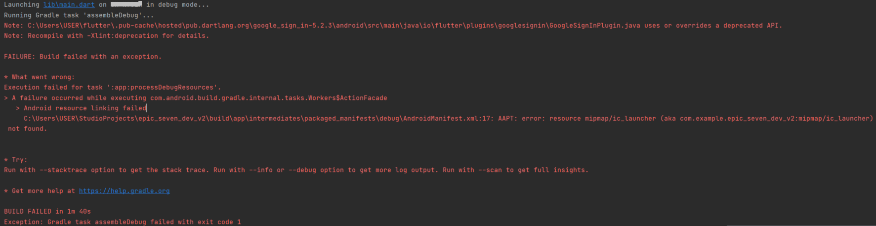 [Flutter, Issue] FAILURE: Build failed with an exception. Execution failed for task ':app:processDebugResources'. Android resource linking failed. AAPT: error: resource mipmap/ic_launcher 본문