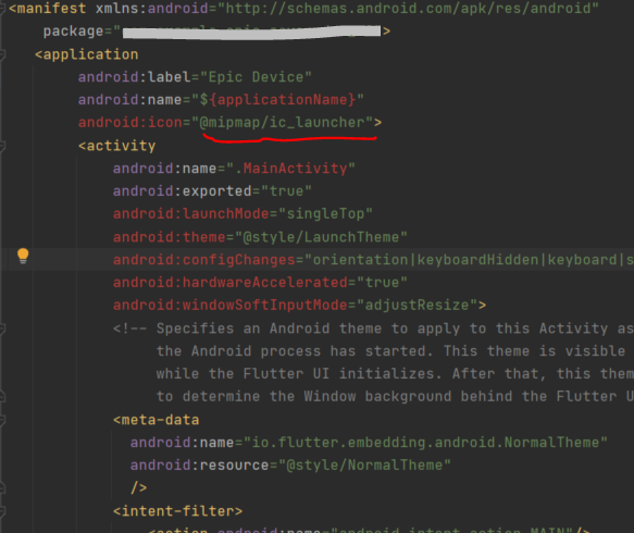 3. 또는, Android>app>src>main>AndroidManifest.xml의 android:icon="@mipmap/ic_launcher" 를 사용하고자 하는 다른 resource명(이미지 명)으로 바꿔준다.