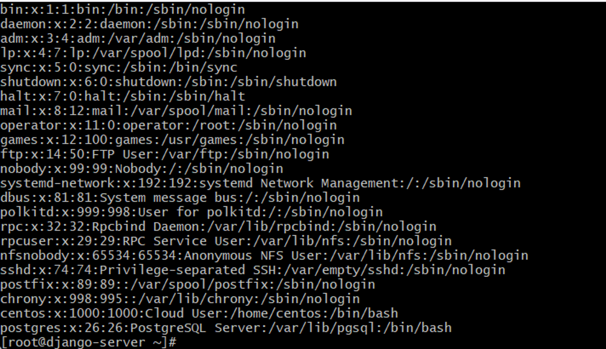 /etc/passwd 는 시스템에 등록되어 있는 사용자들에 대한 정보가 들어있습니다. postgresql을 설치하게 되면 postgres라는 기본 사용자가 생성이 됩니다. 제일 아래 부분에 있음을 확인할 수 있습니다.