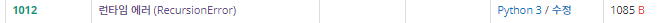 4. 문제를 풀다가 RecursionError를 만나서 확인해보았다. BOJ 사이트에서는 가장 많이 발생하는 이유로 'Python이 정한 최대 재귀 깊이보다 재귀의 깊이가 더 깊어질 때'라고 설명하고 있다. 1000으로 제한하고 있는데, sys.setrecursionlimit(10000)으로 제한의 정도를 10배 더 주었더니, 해결이 되었다. 파이썬으로 재귀함수를 쓸 때, 특히 DFS, BFS에서는 필수적인 코드라고 설명을 하고 있다.