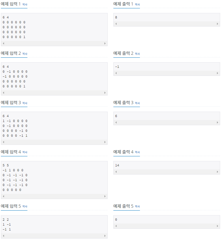 처음에는 matrix를 세팅하는 중, 1과 -1로만 구성 되어있다면, bfs를 굳이 돌리는 과정을 거칠 필요가 없으니까 이부분의 조건을 따로 뺄 예정이 였으나... 틀렸습니다 를 보고는 그냥 전부 bfs를 돌렸다. 다음에 시간이 더 충분하다면, 이런식으로 matrix를 set하는 for문에서 조건문을 하나 더 넣는 것이 시간을 더 단축시킬 수 있지 않을까 생각한다. 하지만...생각지 못한 경우의 수가 있을 것 같기도 하다. 이 부분에 대해서는 추후에 더 해보도록 하겠다.