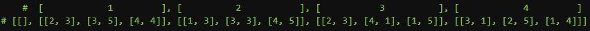 2. 그래프 정보를 가지는 변수(mat_table)를 선언한다. 단방향이 아닌, 양방향이기 때문에, 두 줄에 걸쳐서 넣어준다(윗 그림). 다음은 예제1의 입력이 주어졌을 때, 실제 만들어지는 mat_table 이다(아랫 그림).