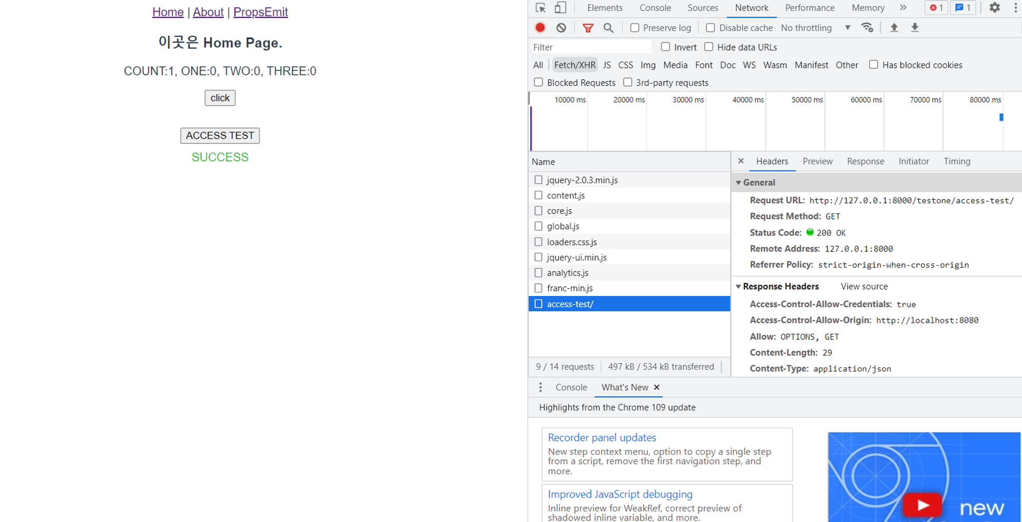 버튼 아래로 ‘SUCCESS’가 보이게 됩니다. 그리고 Network에서 API 요청을 보면,